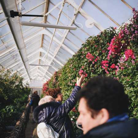 Kolorowa fotografia: wąską alejką spacerują roześmiane seniorki. Podiwiają porośniętą bujną roślinnością ścianę, która mijają.