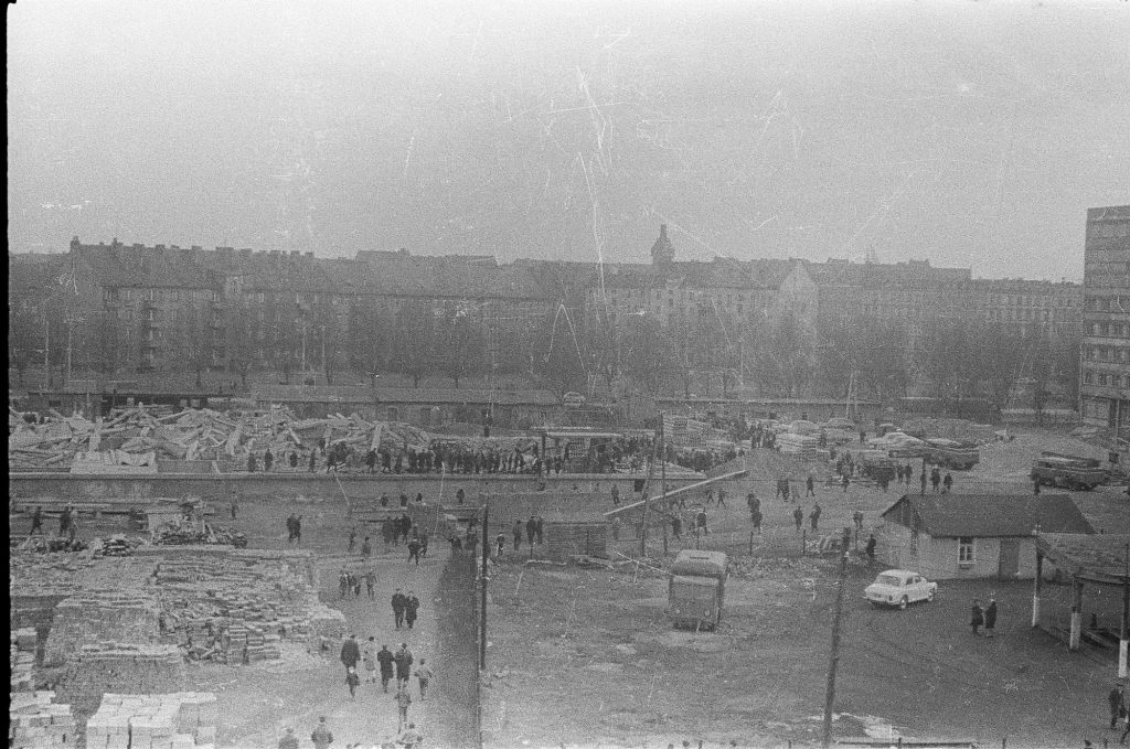 Pamiętam też, jak wyburzali komin, który stał przy tym szpitalu, czy może zakładzie, o którym wspomniałam. Piastowska była cała w gruzach i właśnie tam, przy szkole był komin. Potem, kiedy go zburzyli i usunęli gruzy, zrobiło się puściusieńko. Wcześniej baliśmy się chodzić po gruzach na Placu Grunwaldzkim, bo nie wiadomo było, co w nich jest. Wyburzenie placu w czasie wojny było całkowite, kiedy przygotowywano go pod lotnisko.