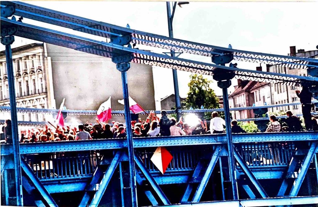Tak, przyniosłam nawet ze sobą ciekawe zdjęcie, które zrobiłam, kiedy kręcono tutaj film „80 milionów”. Jedna ze scen odbywała się na Moście Grunwaldzkim, przez który przechodził pochód. Kiedy kręcono tę scenę, wyszłam i zrobiłam to zdjęcie.