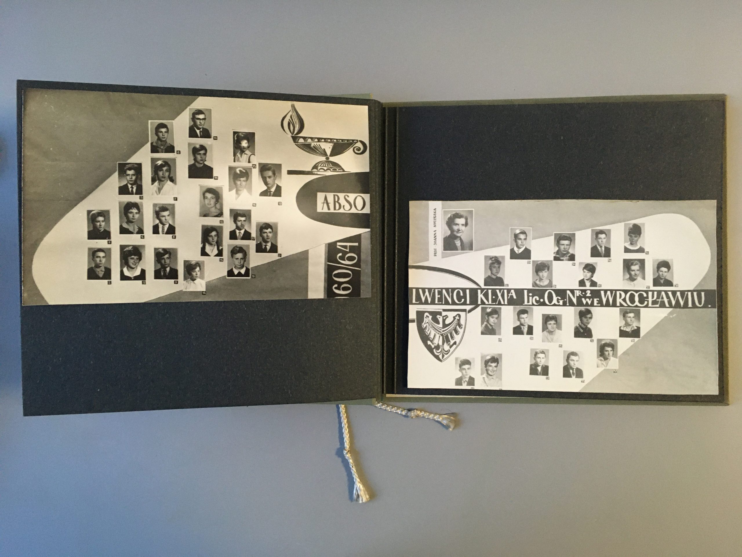 Opis: Kronika absolwentów Liceum Ogólnokształcącego nr 2 im. Piastów Śląskich podarowana prof. Joannie Sicińskiej w dniu otrzymania świadectw dojrzałości. Lata 1960-1964. Na stronie tablo klasowe.
