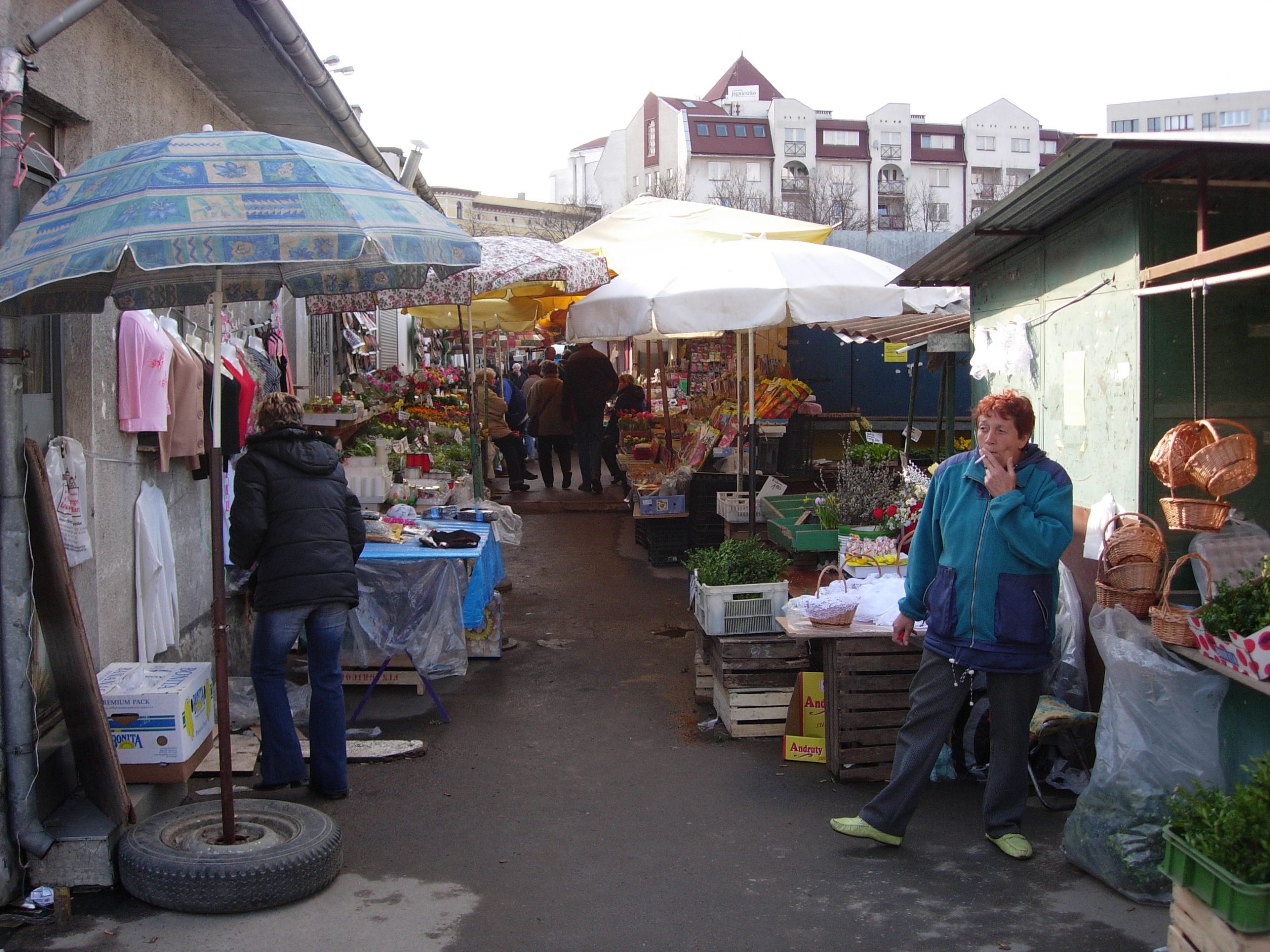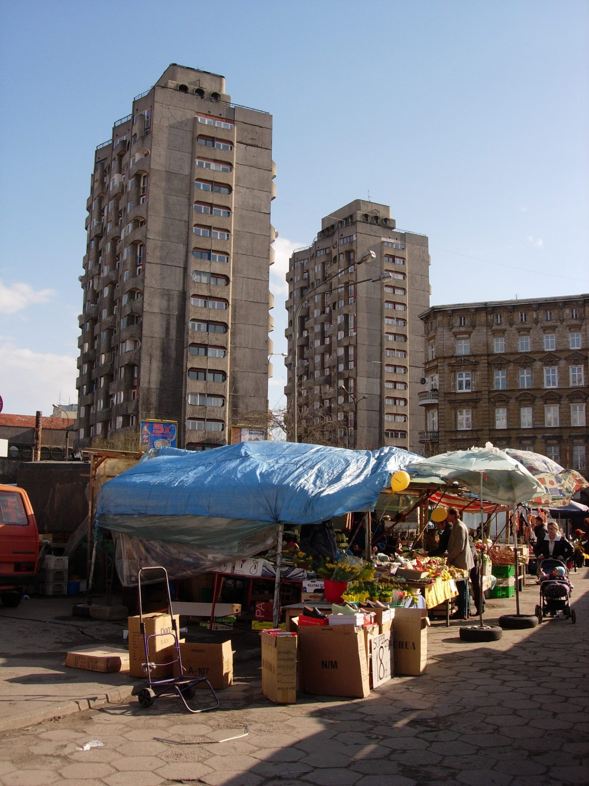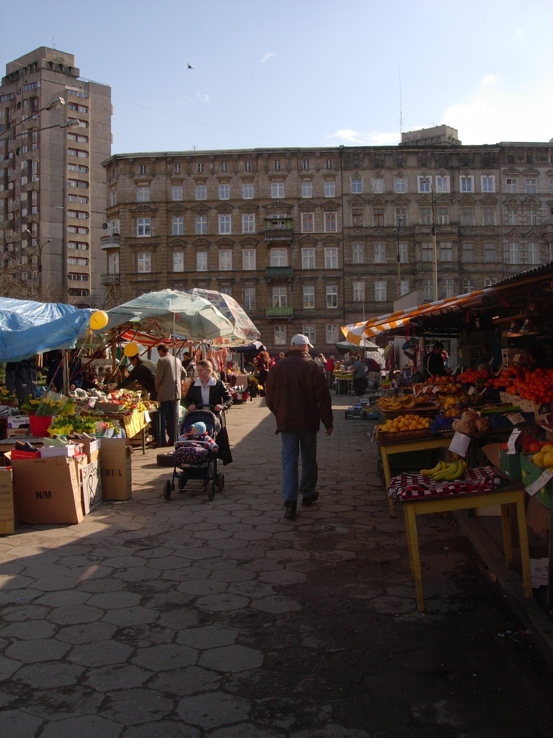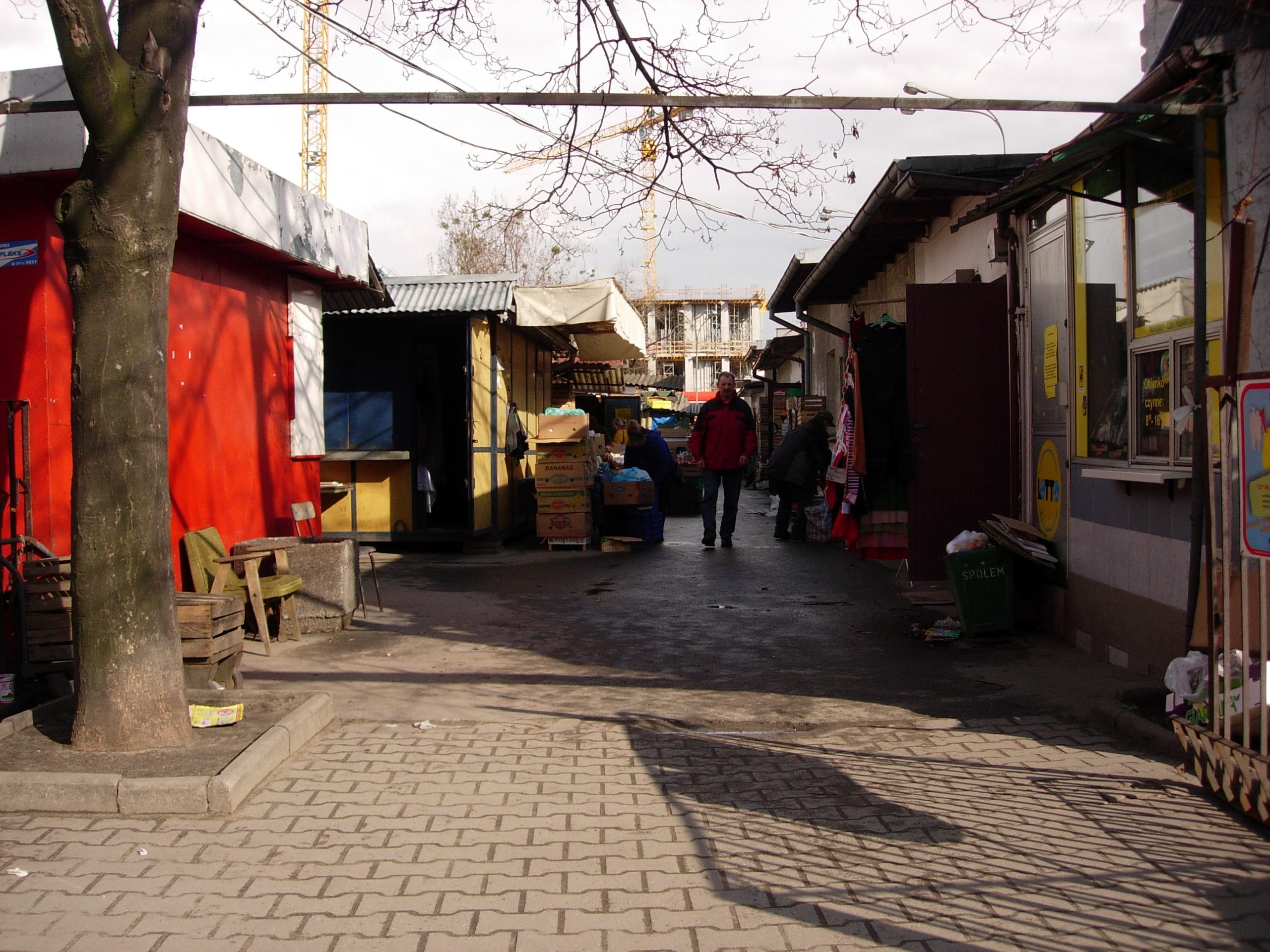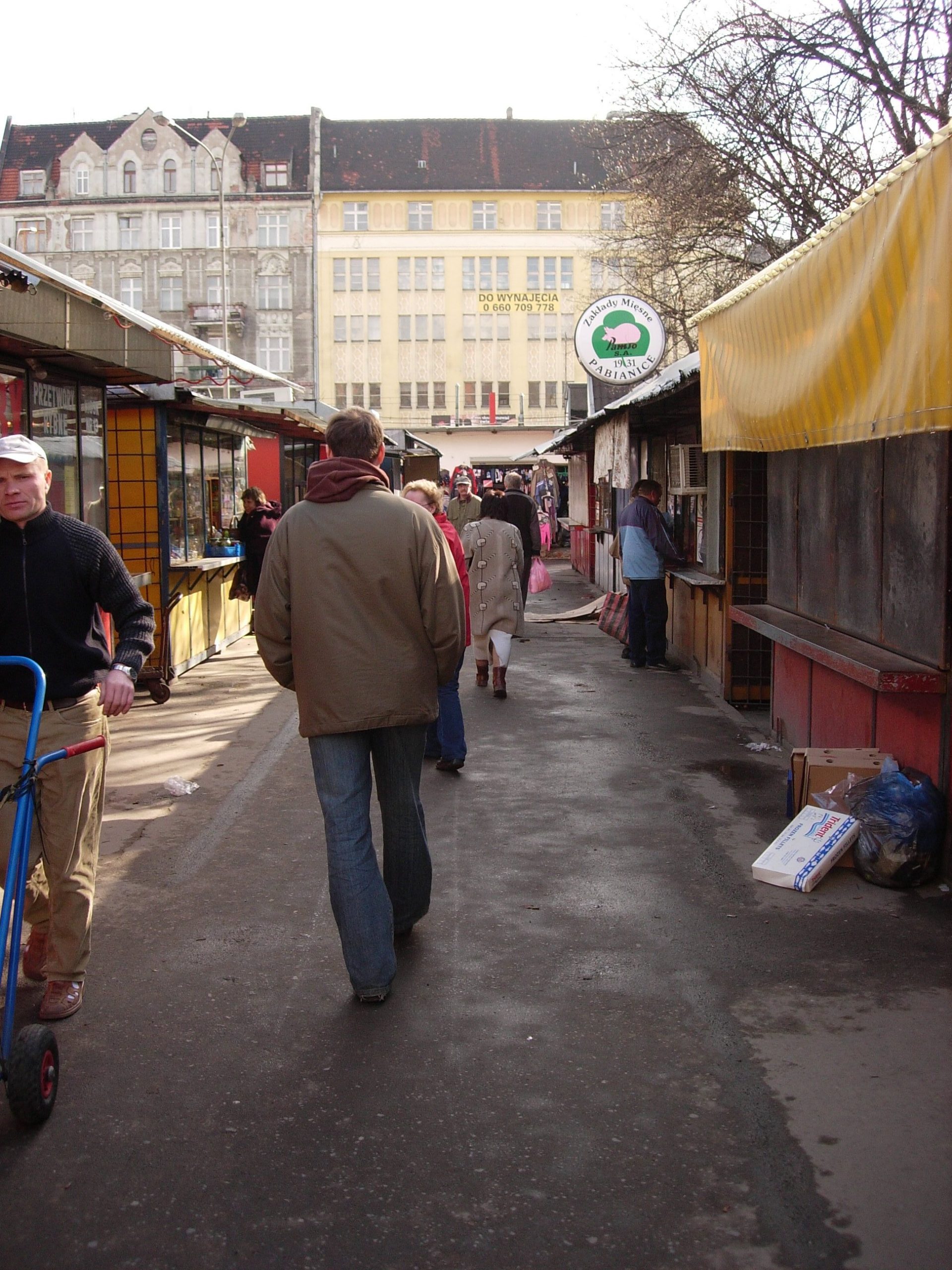 Opis: Targowisko powstało w 1947 roku po zamknięciu szaberplacu, który funkcjonował w tym samym miejscu. Z biegiem lat stało się jednym z najbardziej popularnych targów we Wrocławiu, przyciągającym wielu mieszkańców. W latach 90. XX wieku funkcjonowało pod rozłożonym namiotem cyrkowym „Goliat”. W 2006 roku zostało zamknięte, a na jego miejscu wybudowano Pasaż Grunwaldzki. Na fotografii jedna z alejek targowiska, a w tle budynki Manhattanu.