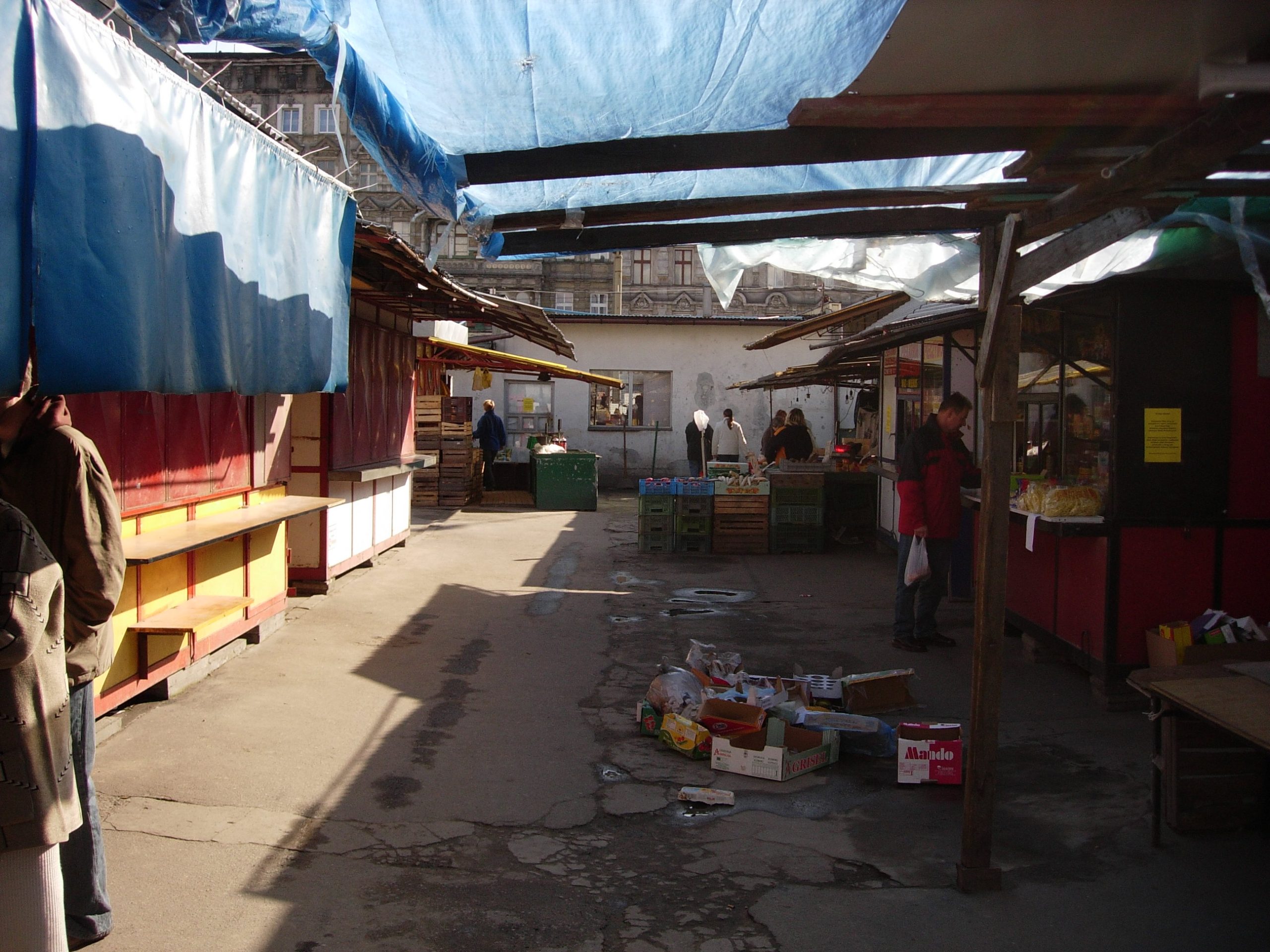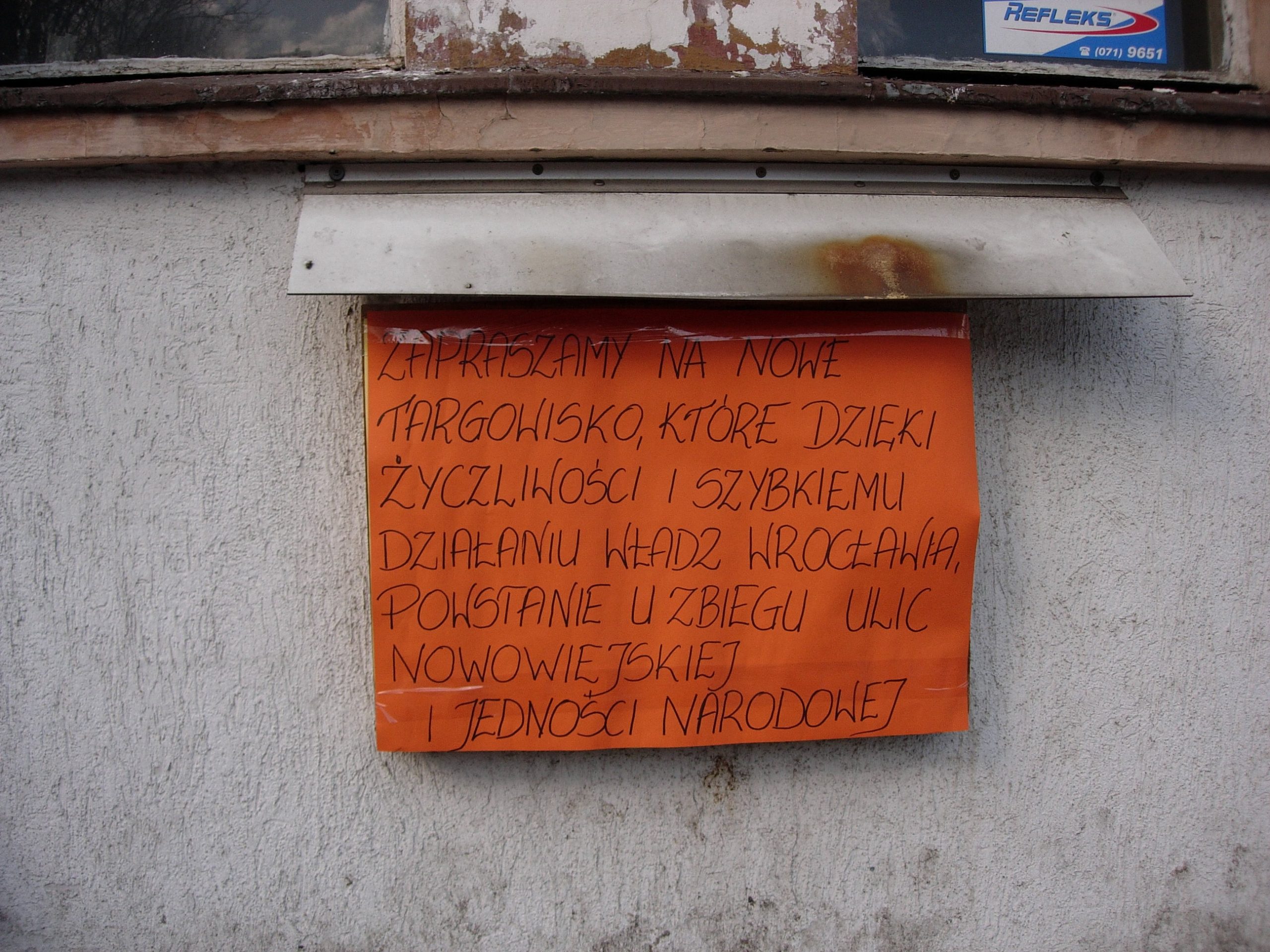 Opis: Targowisko powstało w 1947 roku po zamknięciu szaberplacu, który funkcjonował w tym samym miejscu. Z biegiem lat stało się jednym z najbardziej popularnych targów we Wrocławiu, przyciągającym wielu mieszkańców. W latach 90. XX wieku funkcjonowało pod rozłożonym namiotem cyrkowym „Goliat”. W 2006 roku zostało zamknięte, a na jego miejscu wybudowano Pasaż Grunwaldzki. Na fotografii informacja i plakat Stowarzyszenie Prywatnych Kupców 1410 w sprawie zamknięcia targowiska.