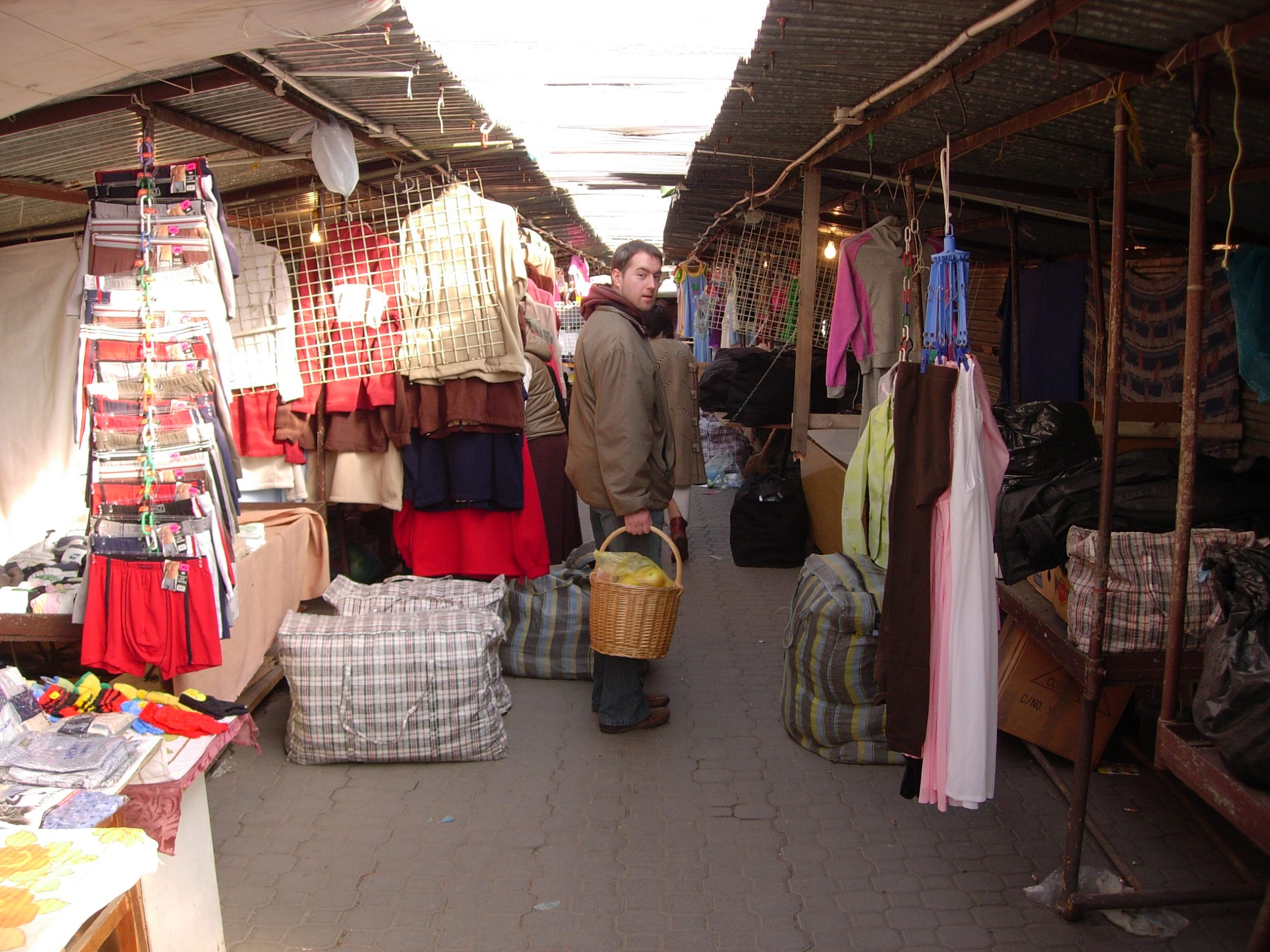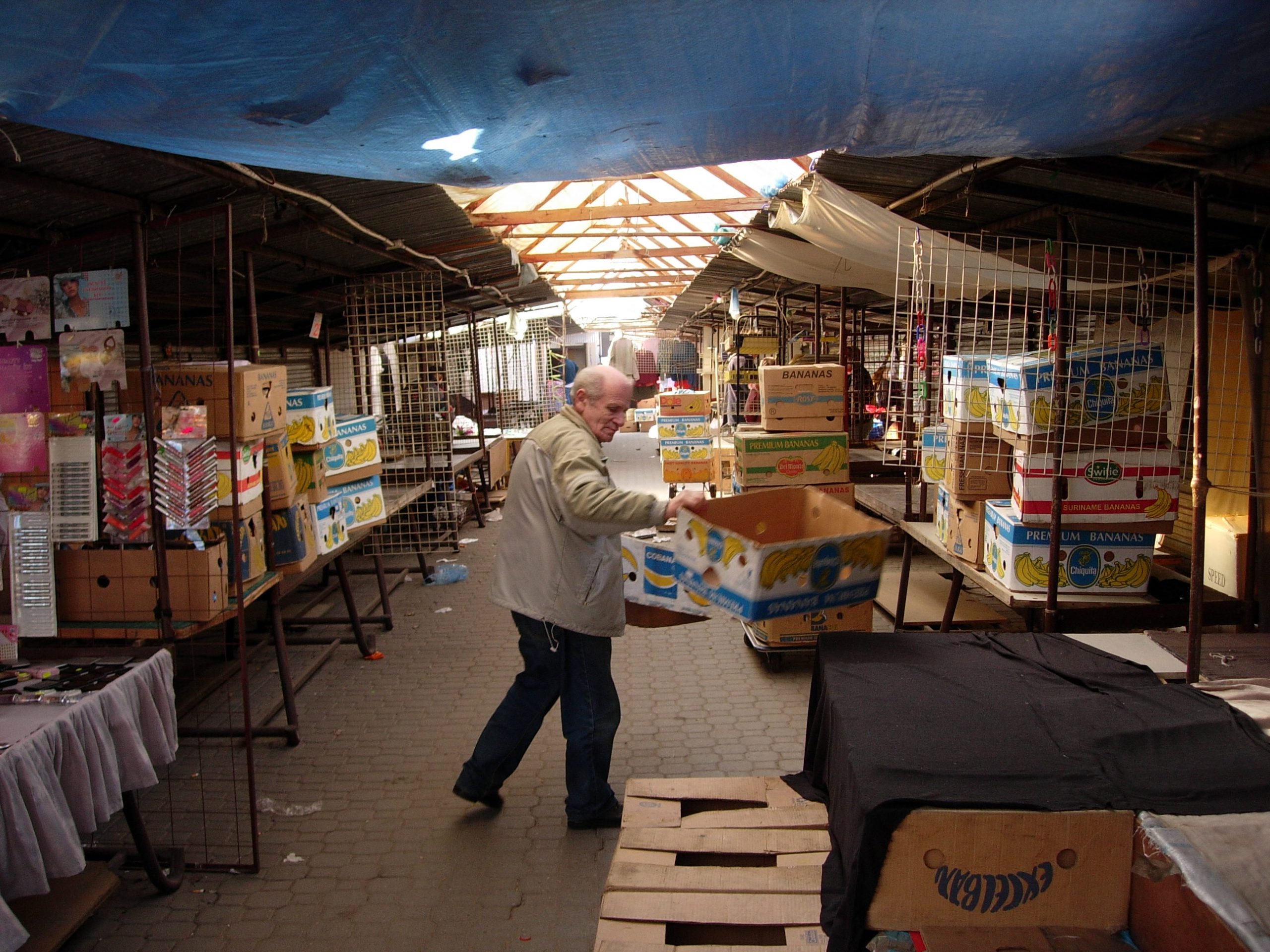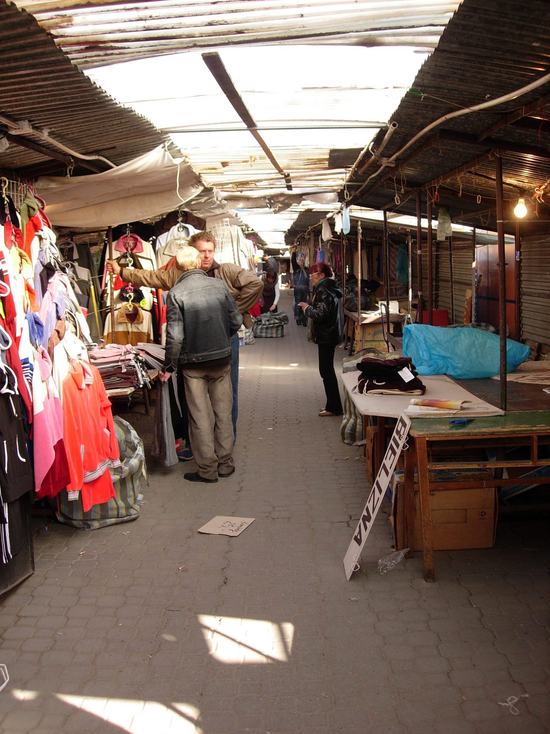 Opis: Targowisko powstało w 1947 roku po zamknięciu szaberplacu, który funkcjonował w tym samym miejscu. Z biegiem lat stało się jednym z najbardziej popularnych targów we Wrocławiu, przyciągającym wielu mieszkańców. W latach 90. XX wieku funkcjonowało pod rozłożonym namiotem cyrkowym „Goliat”. W 2006 roku zostało zamknięte, a na jego miejscu wybudowano Pasaż Grunwaldzki. Na fotografii jedna z alejek targowiska.
