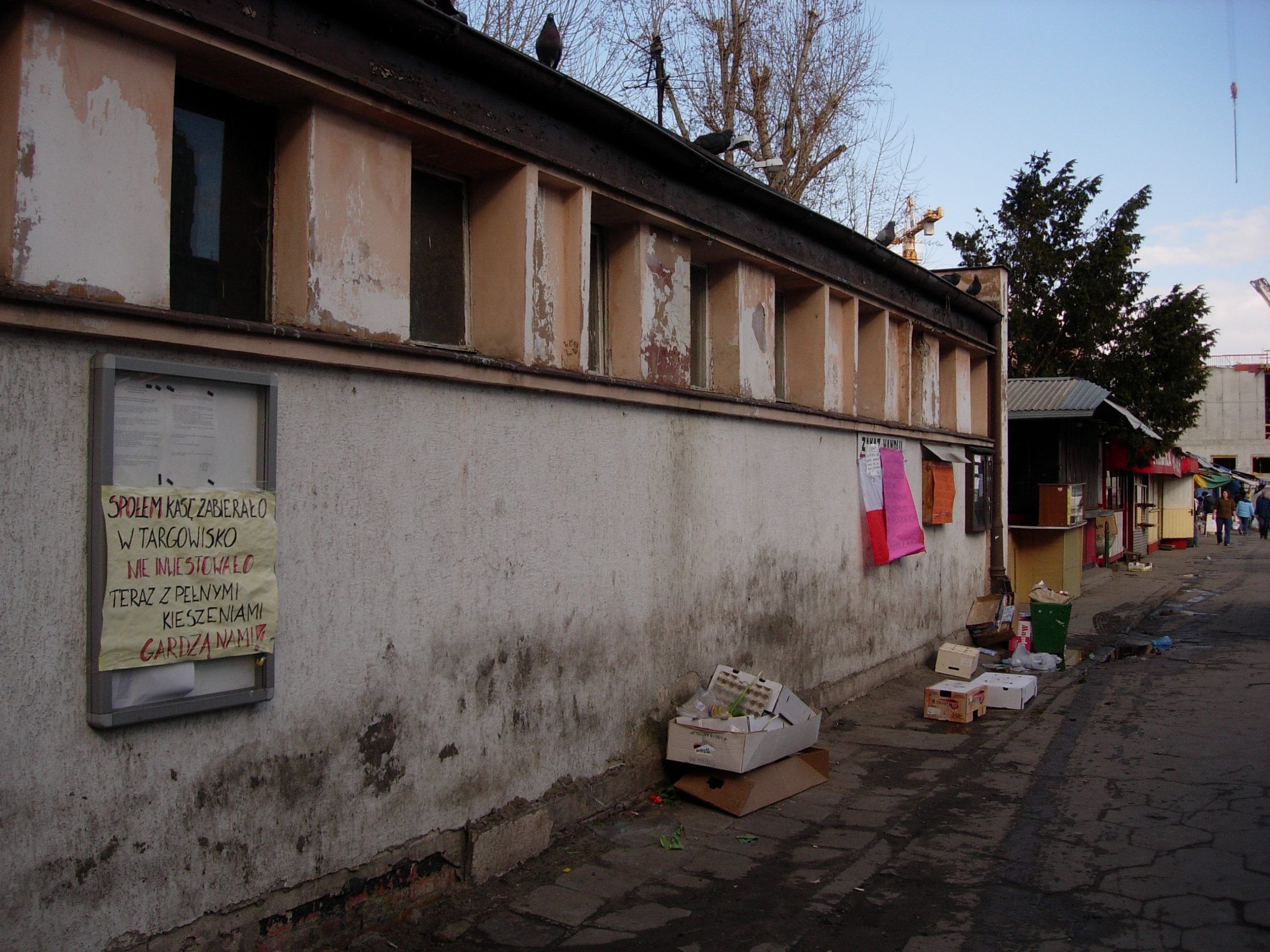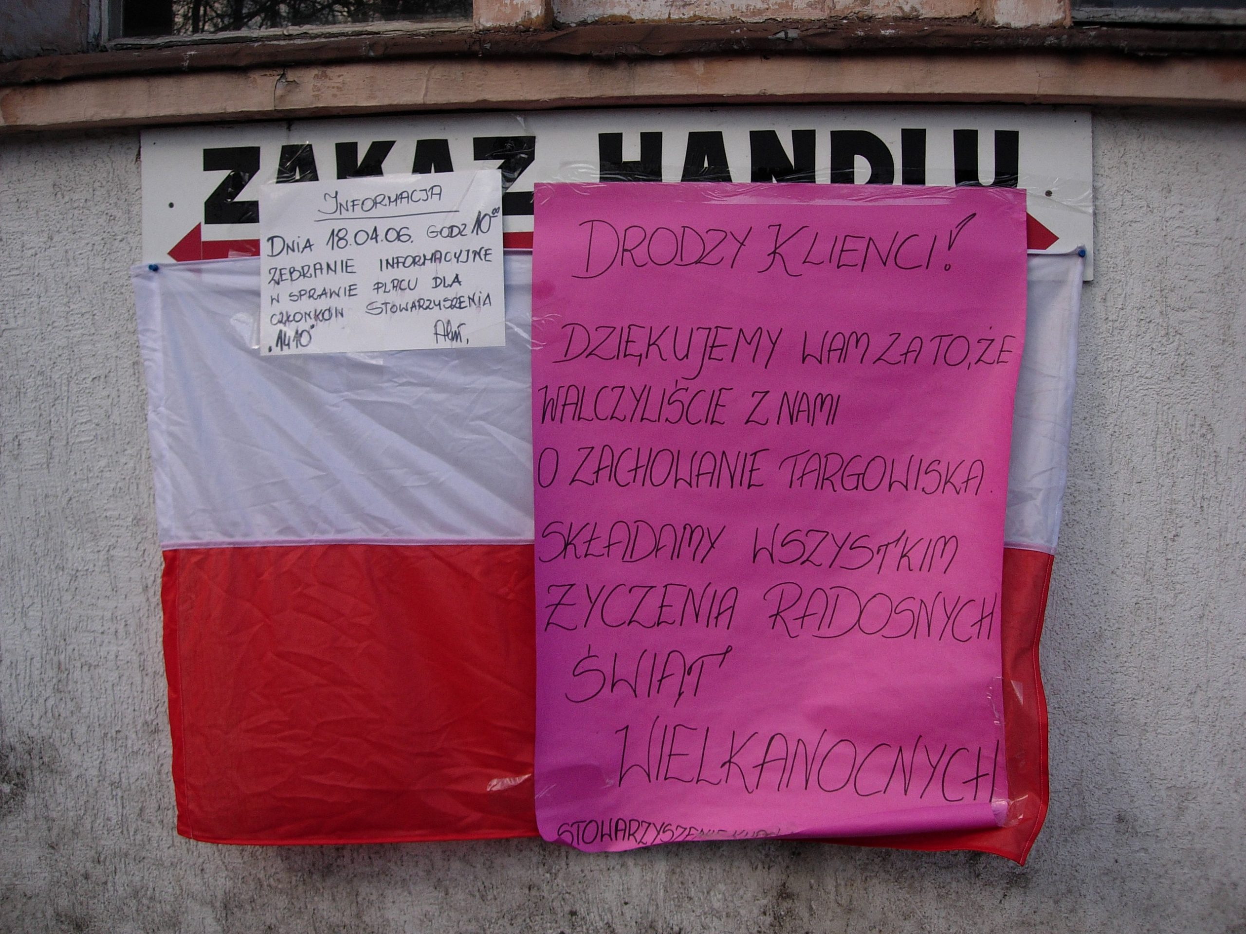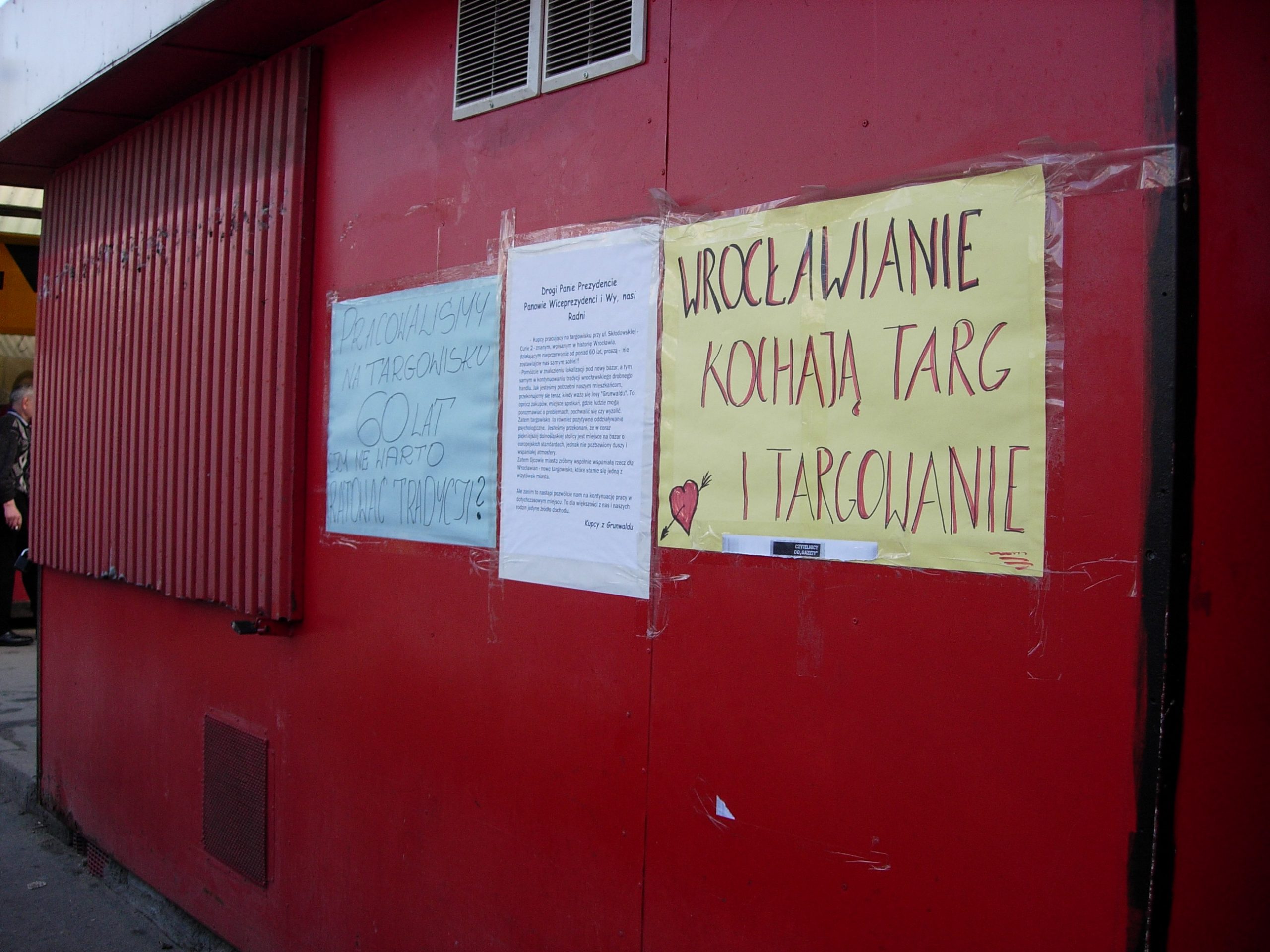 Opis: Targowisko powstało w 1947 roku po zamknięciu szaberplacu, który funkcjonował w tym samym miejscu. Z biegiem lat stało się jednym z najbardziej popularnych targów we Wrocławiu, przyciągającym wielu mieszkańców. W latach 90. XX wieku funkcjonowało pod rozłożonym namiotem cyrkowym „Goliat”. W 2006 roku zostało zamknięte, a na jego miejscu wybudowano Pasaż Grunwaldzki. Na fotografii plakat protestacyjny kierowany pod adresem właścicieli terentu – PSS Społem Północ.