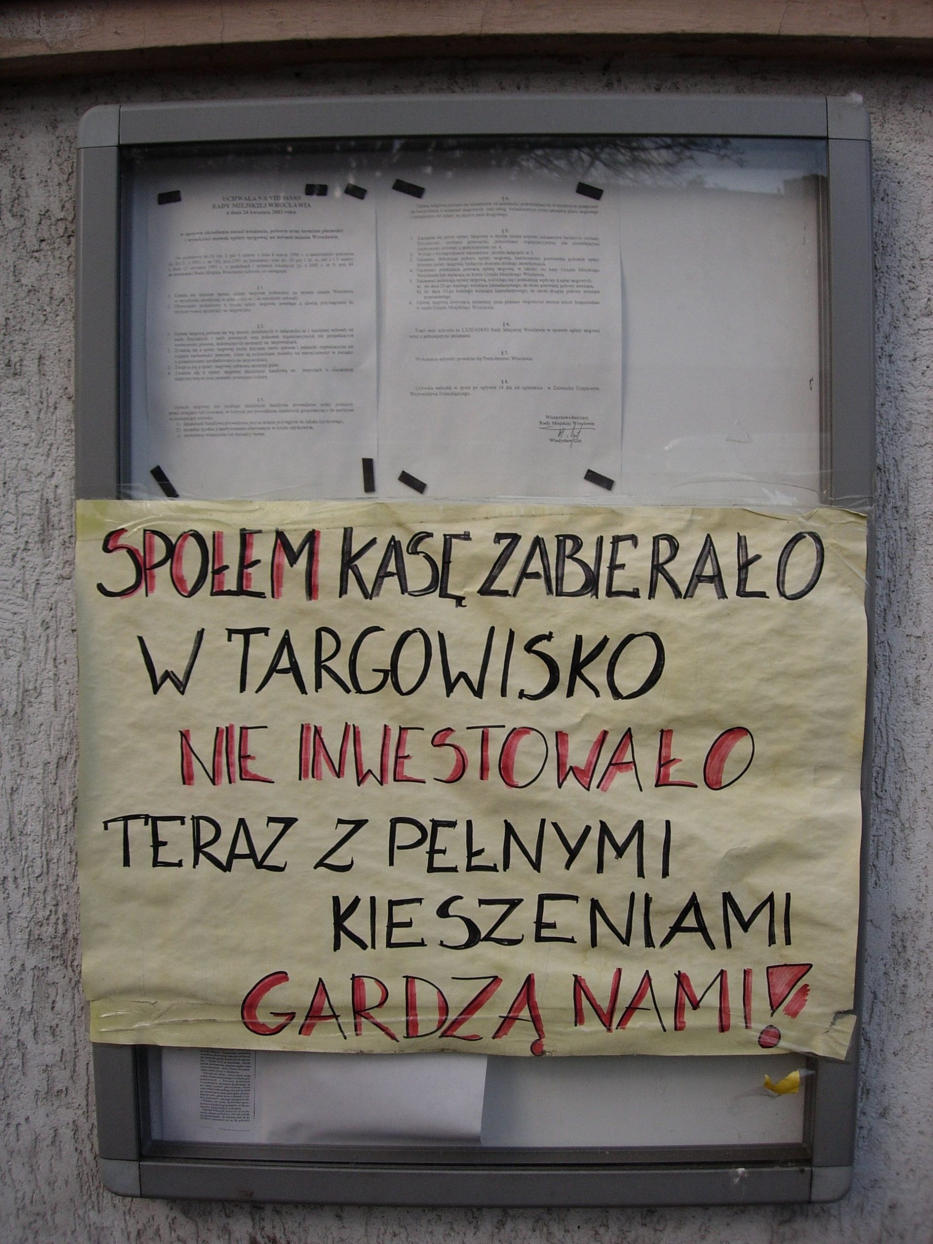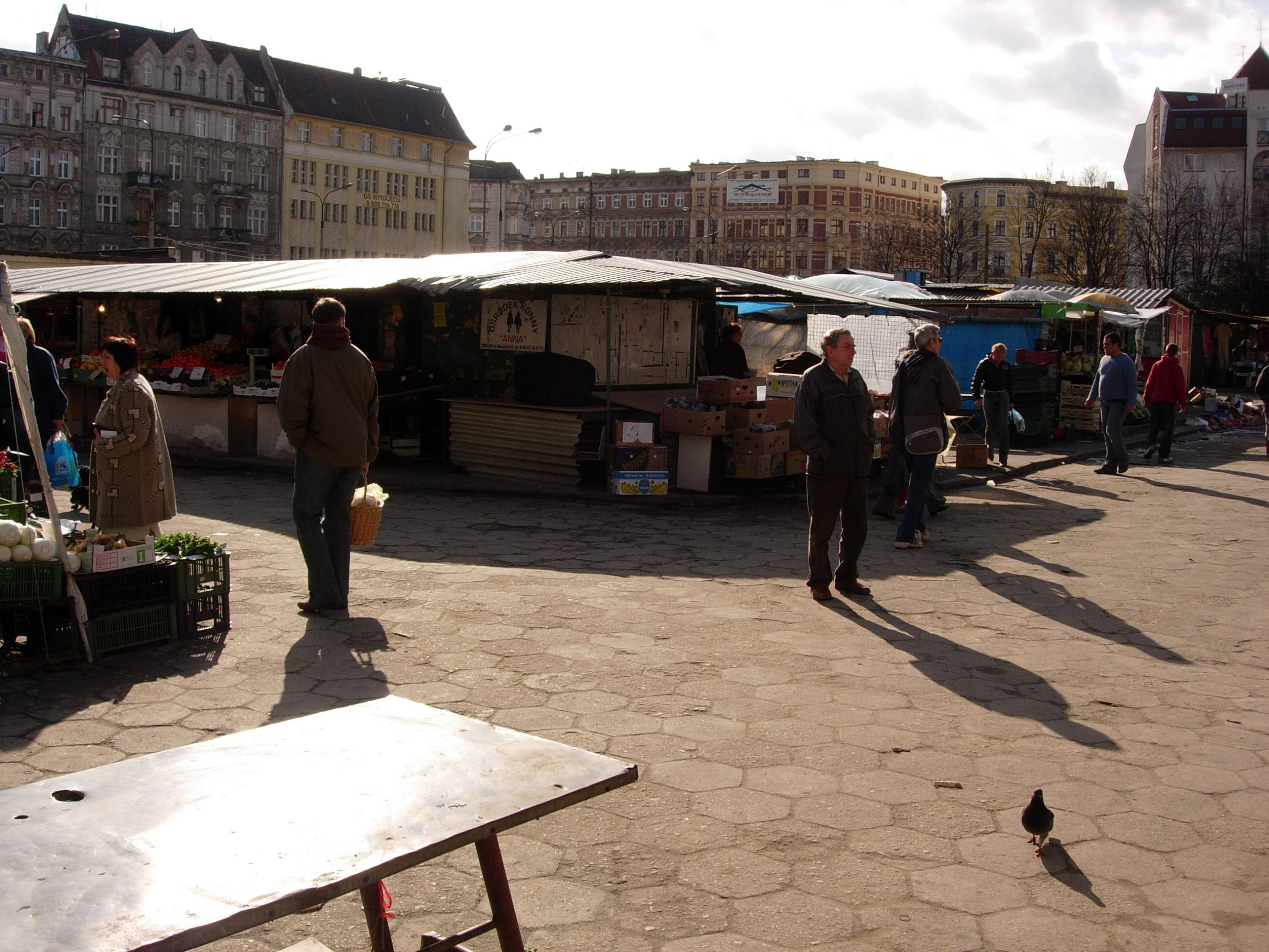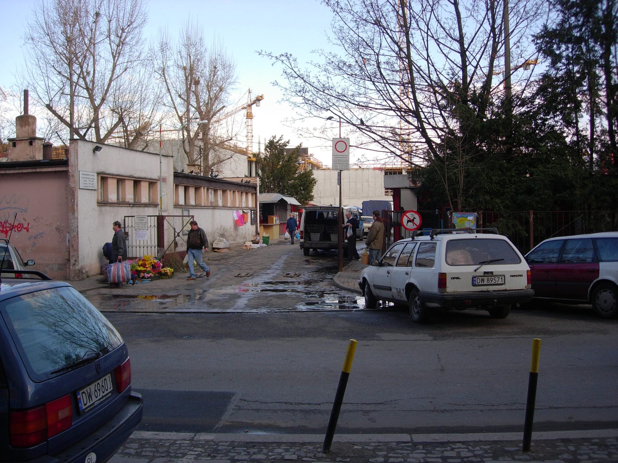 Opis: Targowisko powstało w 1947 roku po zamknięciu szaberplacu, który funkcjonował w tym samym miejscu. Z biegiem lat stało się jednym z najbardziej popularnych targów we Wrocławiu, przyciągającym wielu mieszkańców. W latach 90. XX wieku funkcjonowało pod rozłożonym namiotem cyrkowym „Goliat”. W 2006 roku zostało zamknięte, a na jego miejscu wybudowano Pasaż Grunwaldzki. Na fotografii plakat protestacyjny kierowany pod adresem właścicieli terentu – PSS Społem Północ.