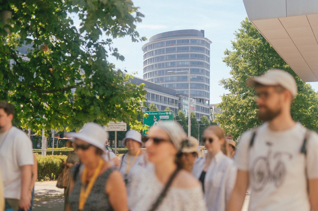 Po raz drugi, pod przewodnictwem Ewy Pluty, ruszyliśmy poznać zakamarki, historie i miejskie legendy związane z Placem Grunwaldzkim z audiodeskrypcją. Tym razem przeszliśmy kółko po północnej stronie osiedla. Na trasie mijaliśmy m.in.: budynek zwany „książką” czy słynny bar po Złotą Kolumną.