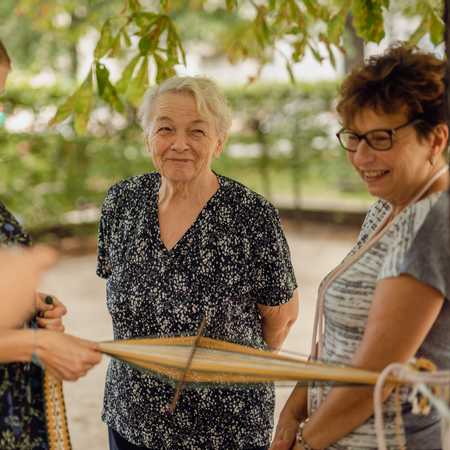 Kwadratowa grafika: Na różowym tle niebieski napis: Zbiórka w drogerii dm. Razem na rzecz seniorów i seniorek z Grunwaldu. Powyżej napisu zdjęcie roześmianych seniorek podczas warsztatów tkackich.